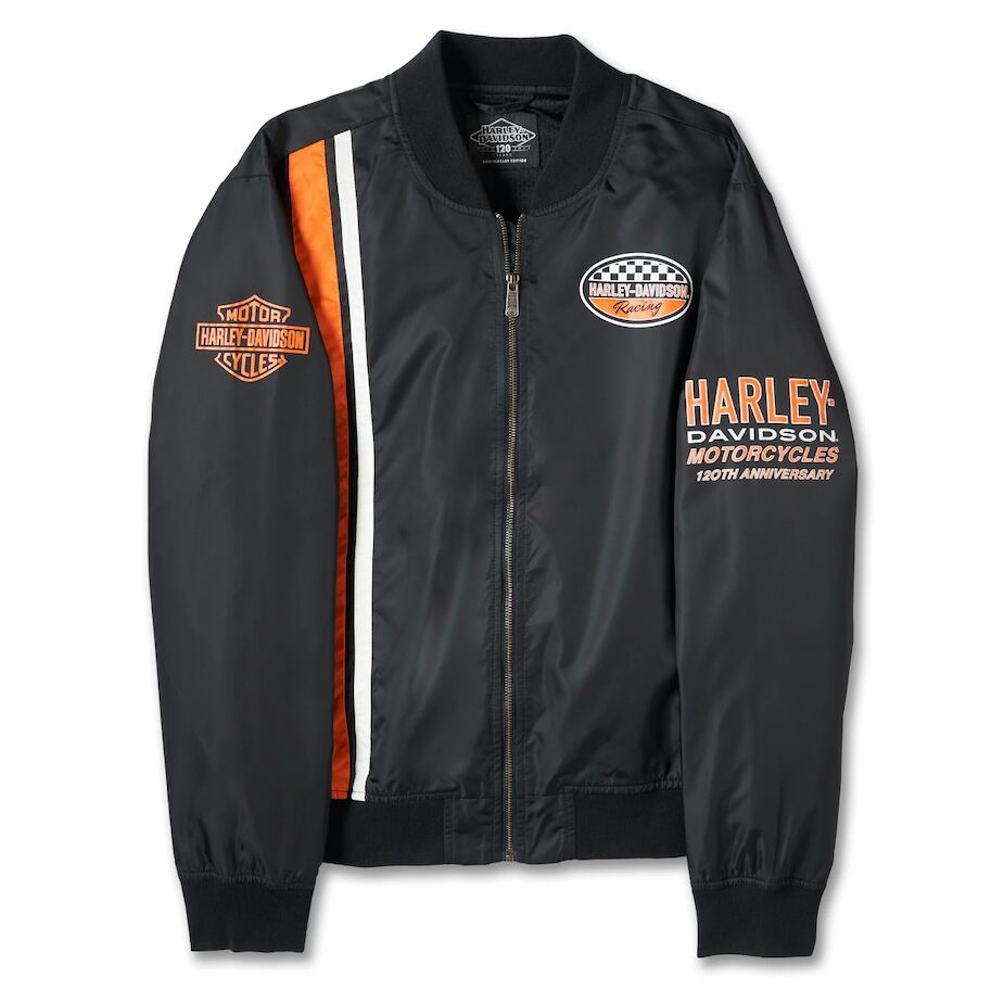 左胸にHarley-Davidson® ロゴ、右腕にバー&シールドロゴ、左腕に120th記念ロゴ。
