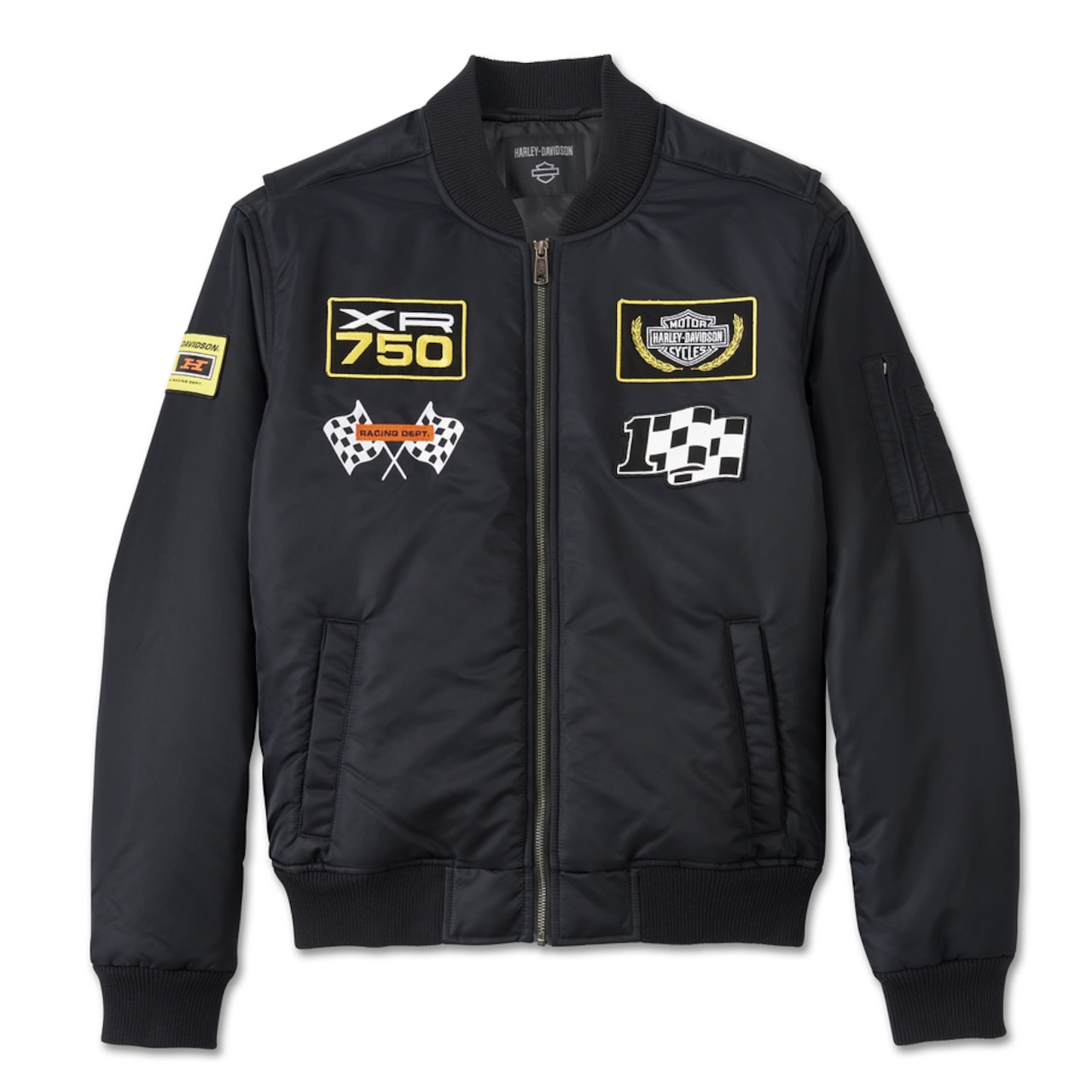 フロントと右腕に様々なロゴ刺繍パッチ、