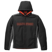 バー&シールド・フーデッド・ソフトシェル・ジャケット。ブラック/グレイ/オレンジ。